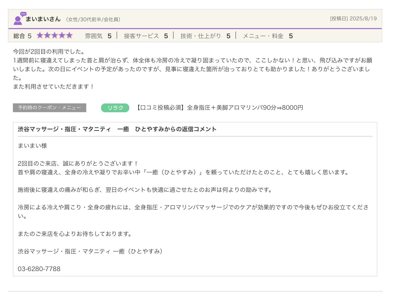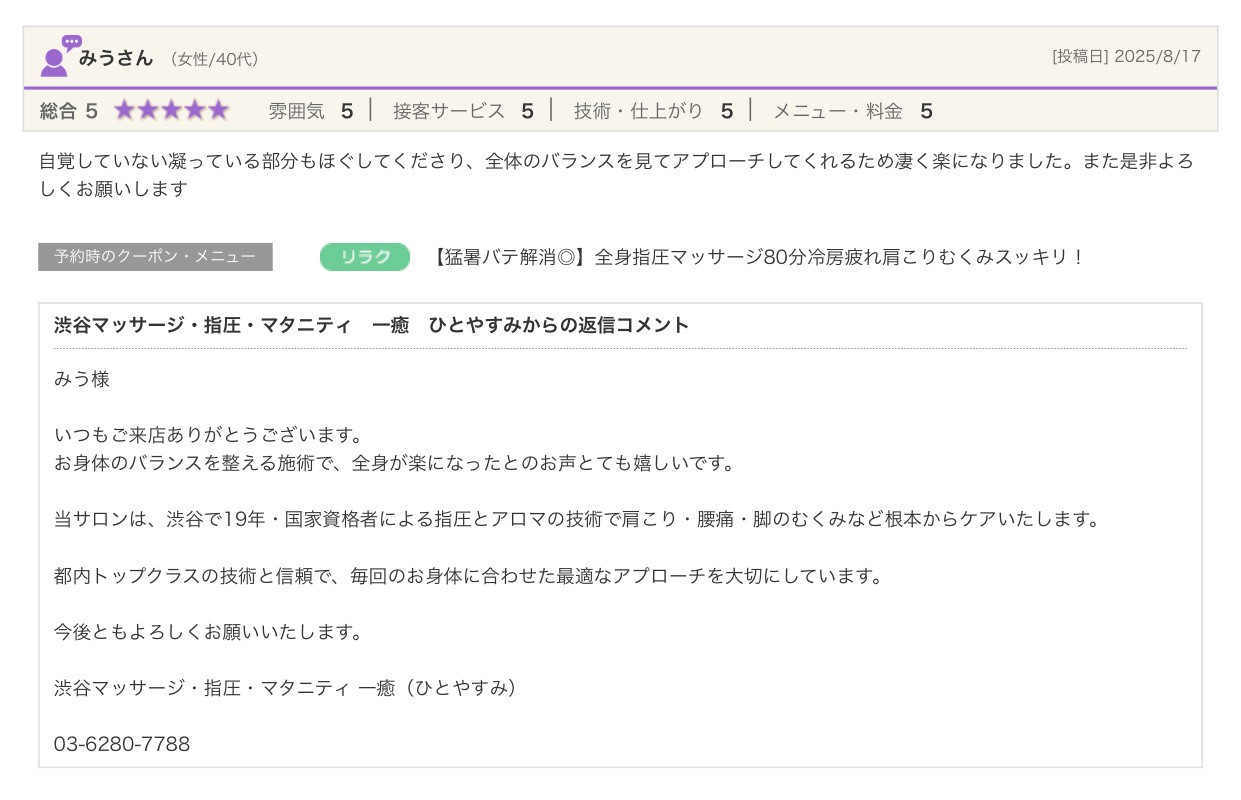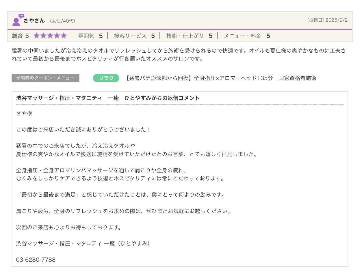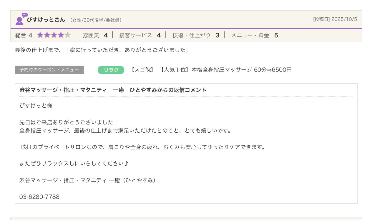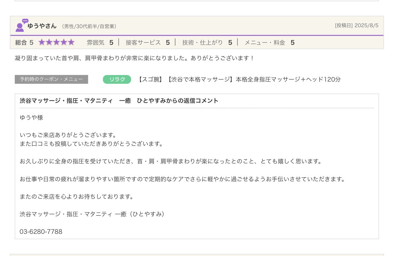 渋谷の指圧・マッサージサロン:一癒(ひとやすみ) > 口コミ > 【2025年】嬉しい口コミをご紹介☆彡