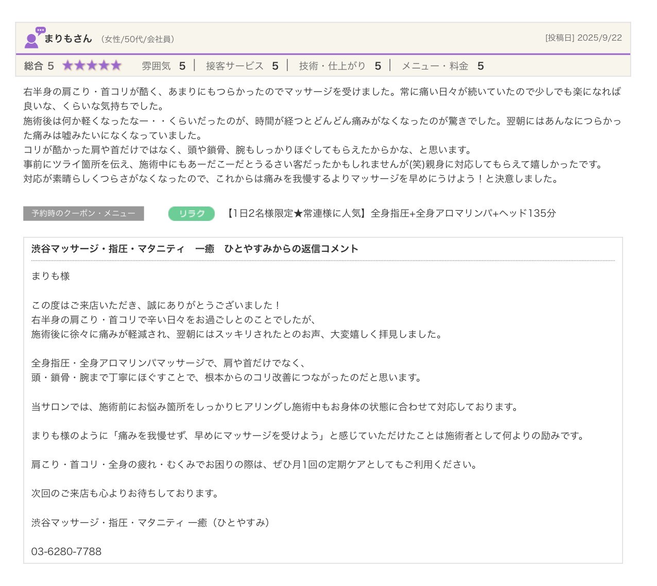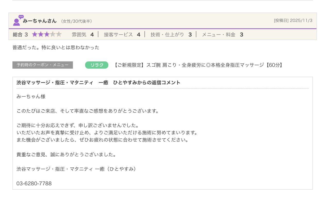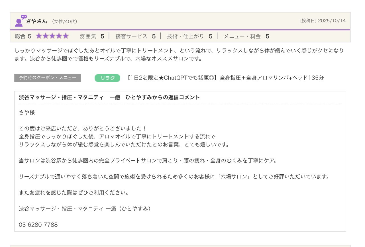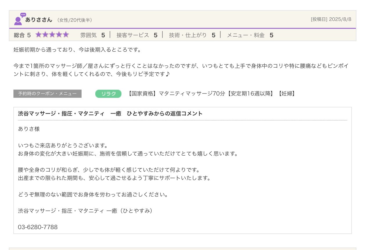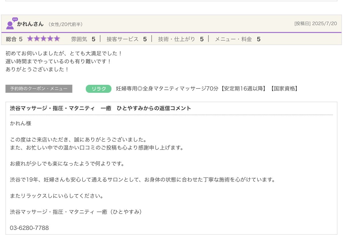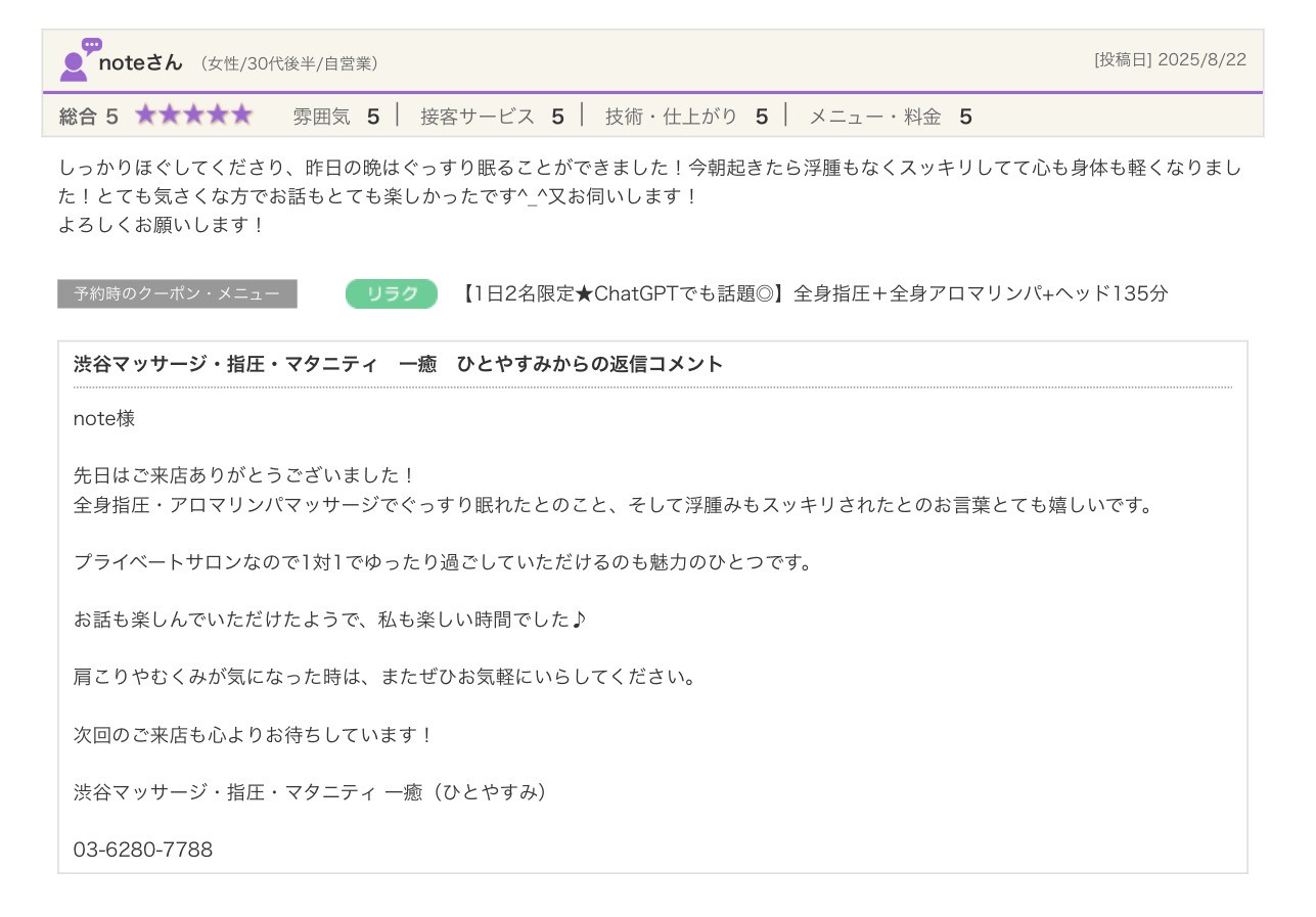 渋谷の指圧・マッサージサロン:一癒(ひとやすみ) > 口コミ > 【2025年】嬉しい口コミをご紹介☆彡
