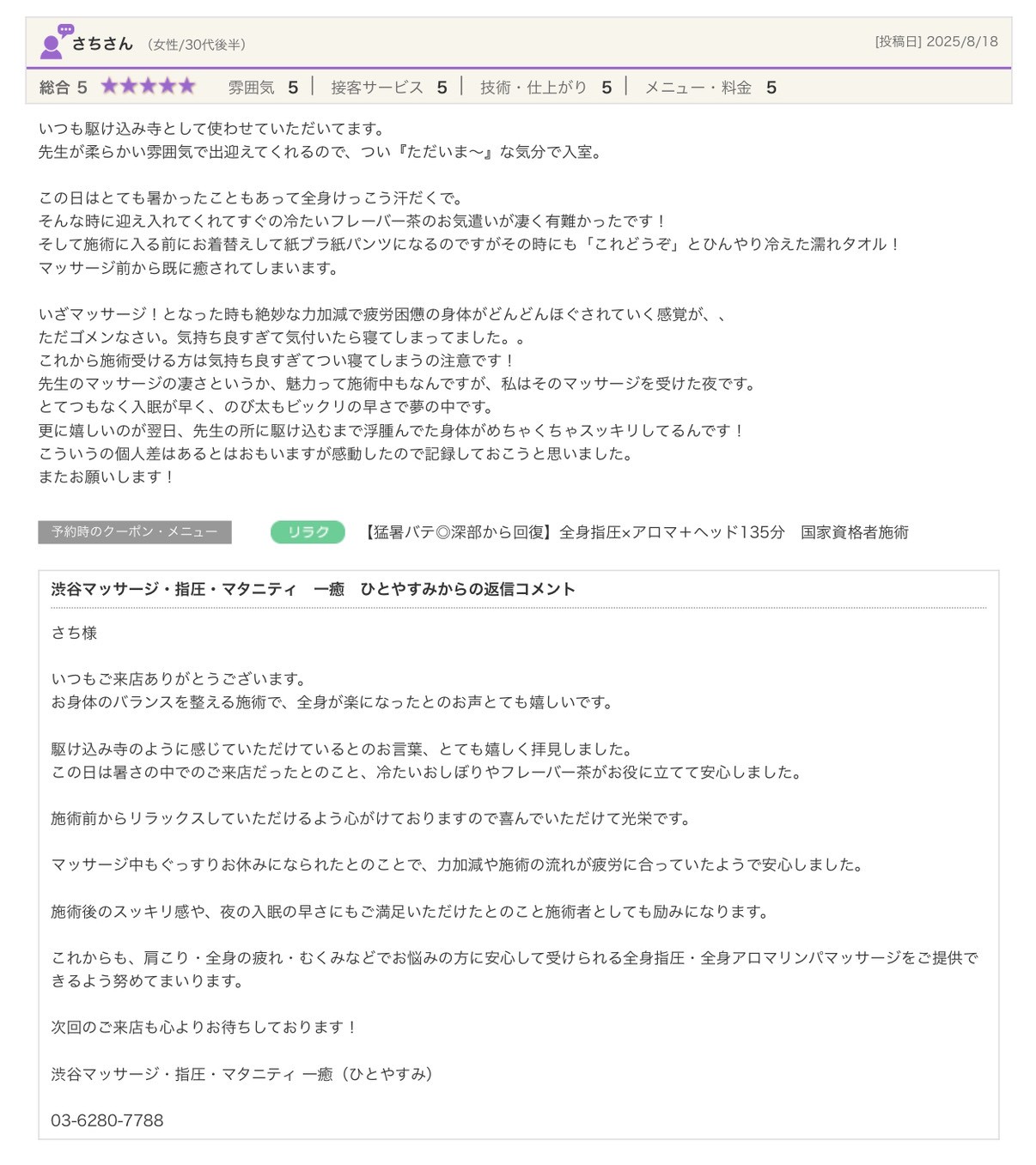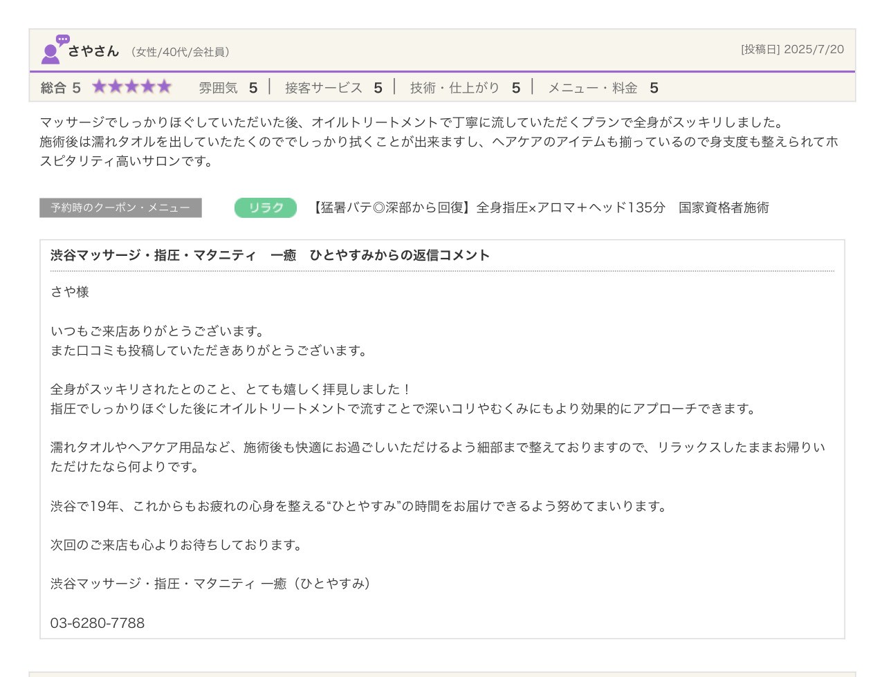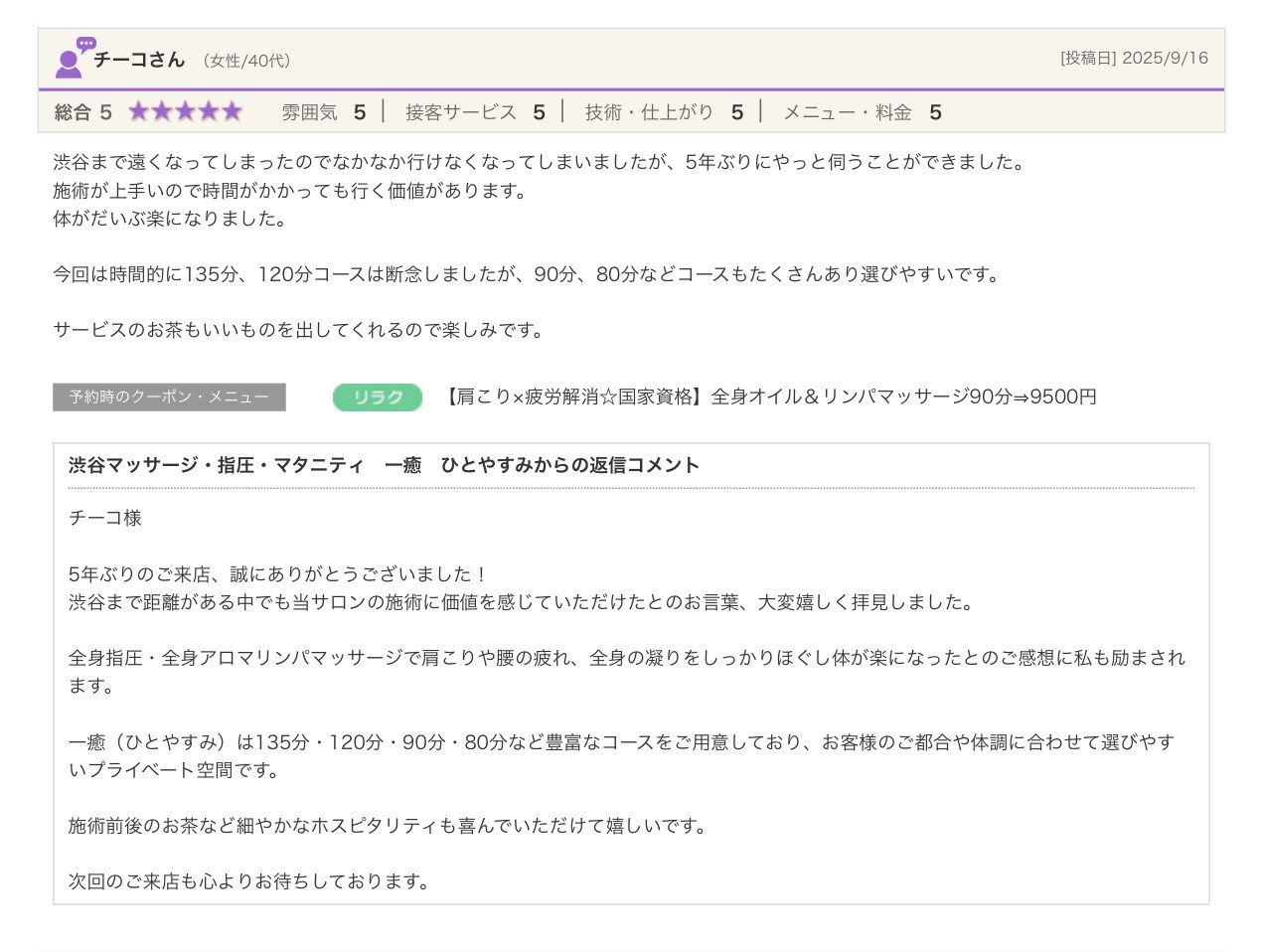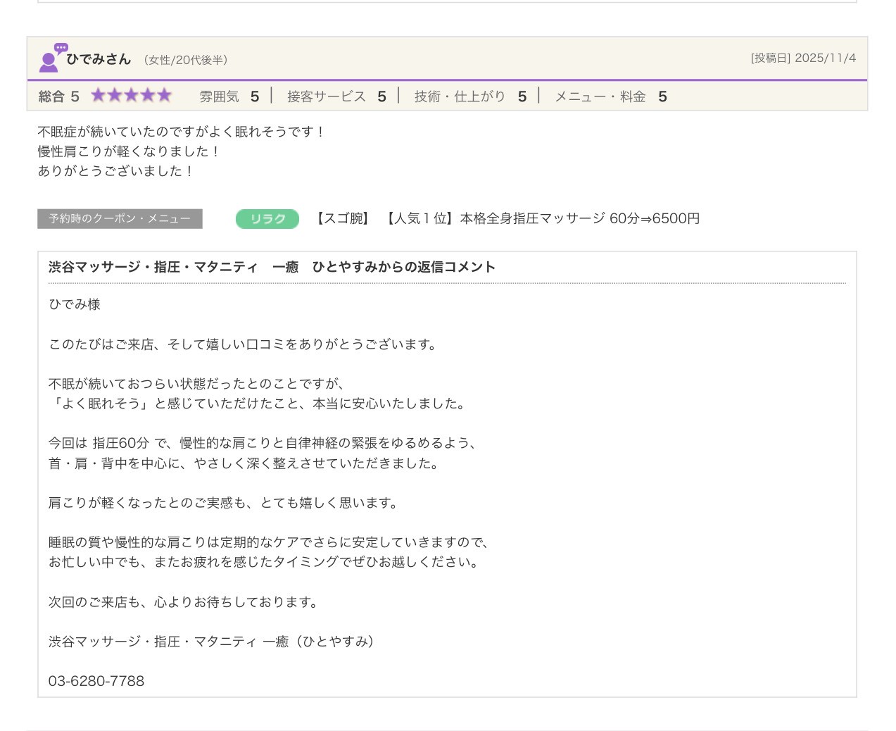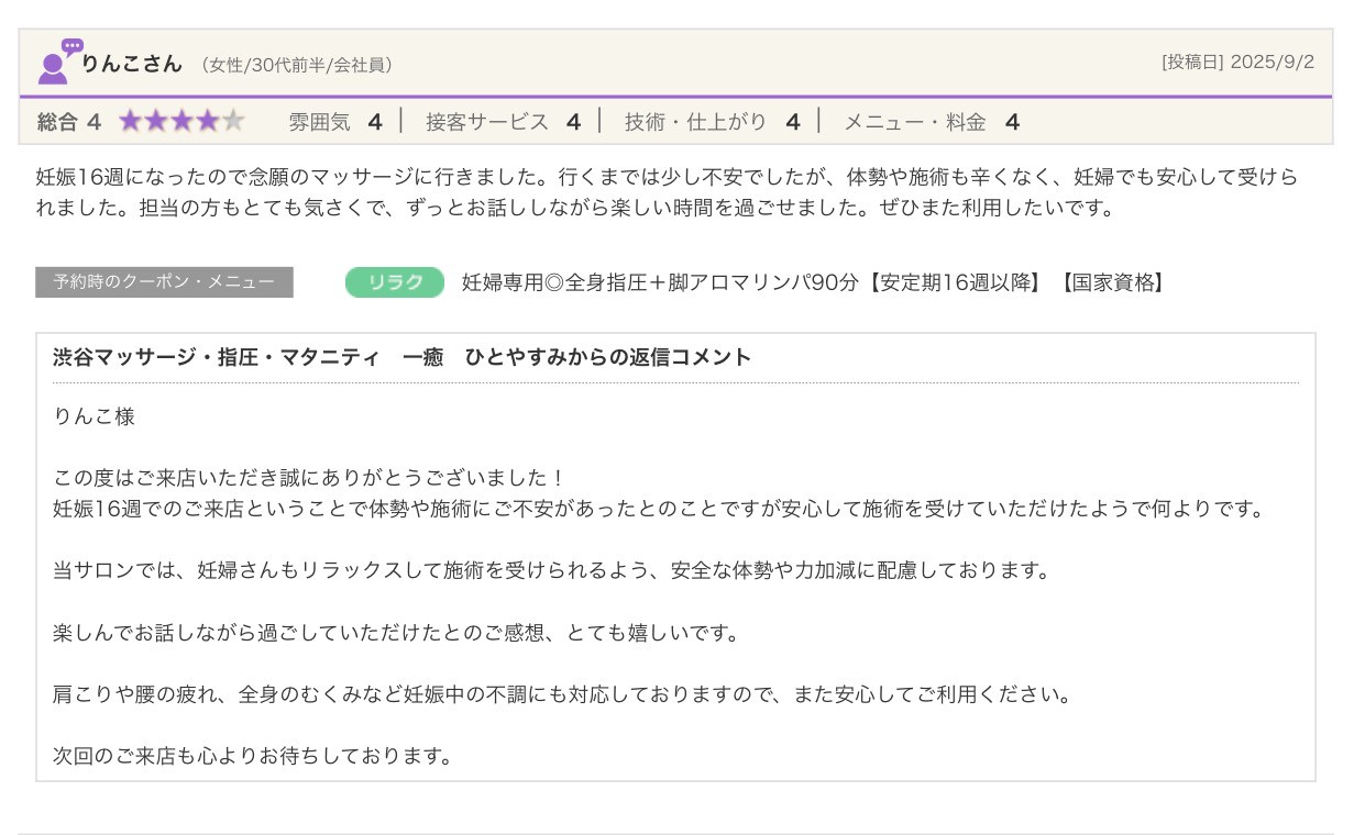渋谷の指圧・マッサージサロン:一癒(ひとやすみ) > 口コミ > 【2025年】嬉しい口コミをご紹介☆彡