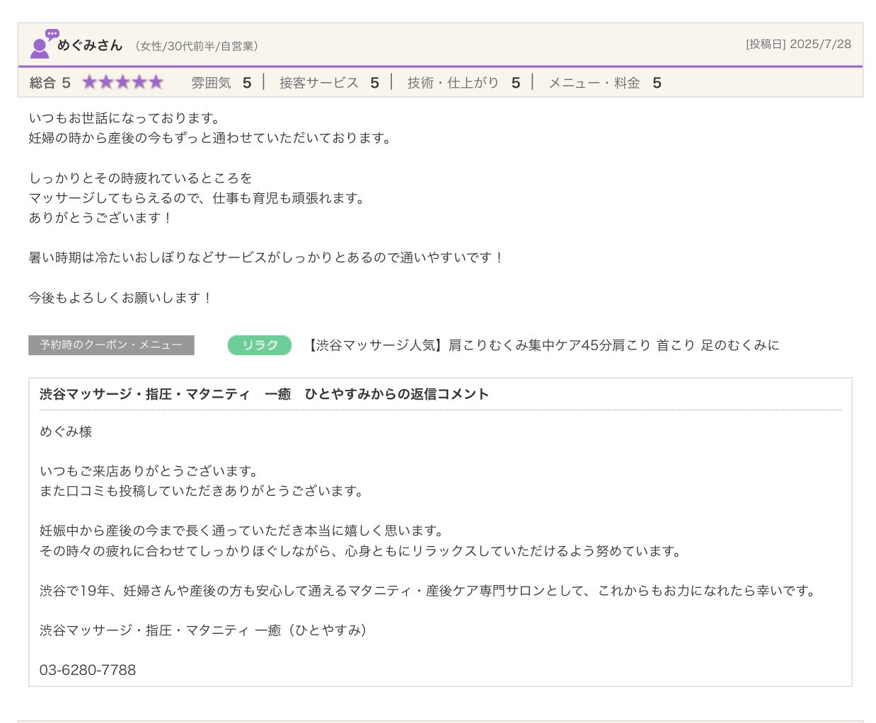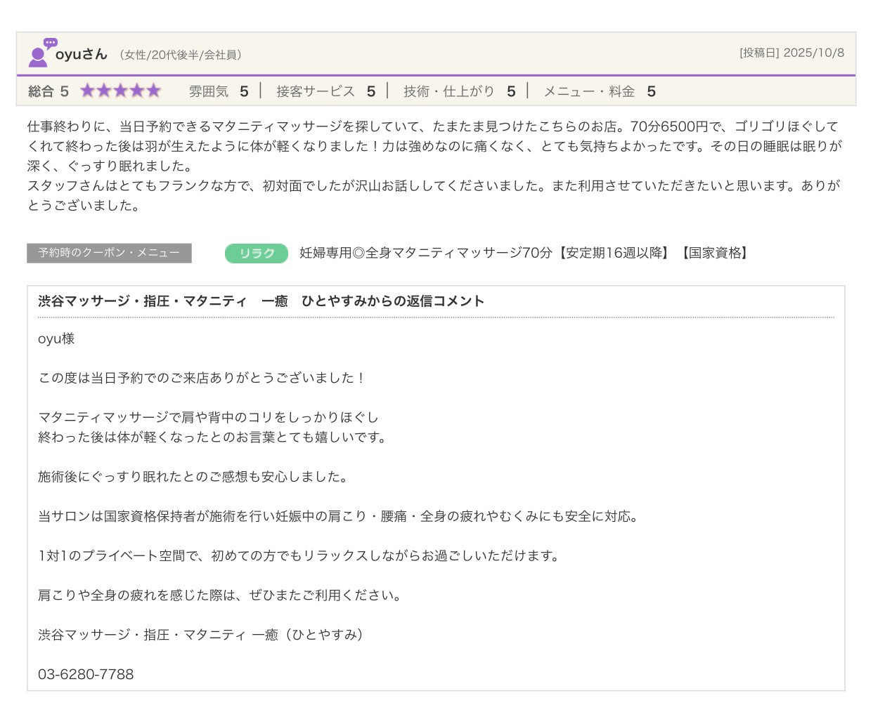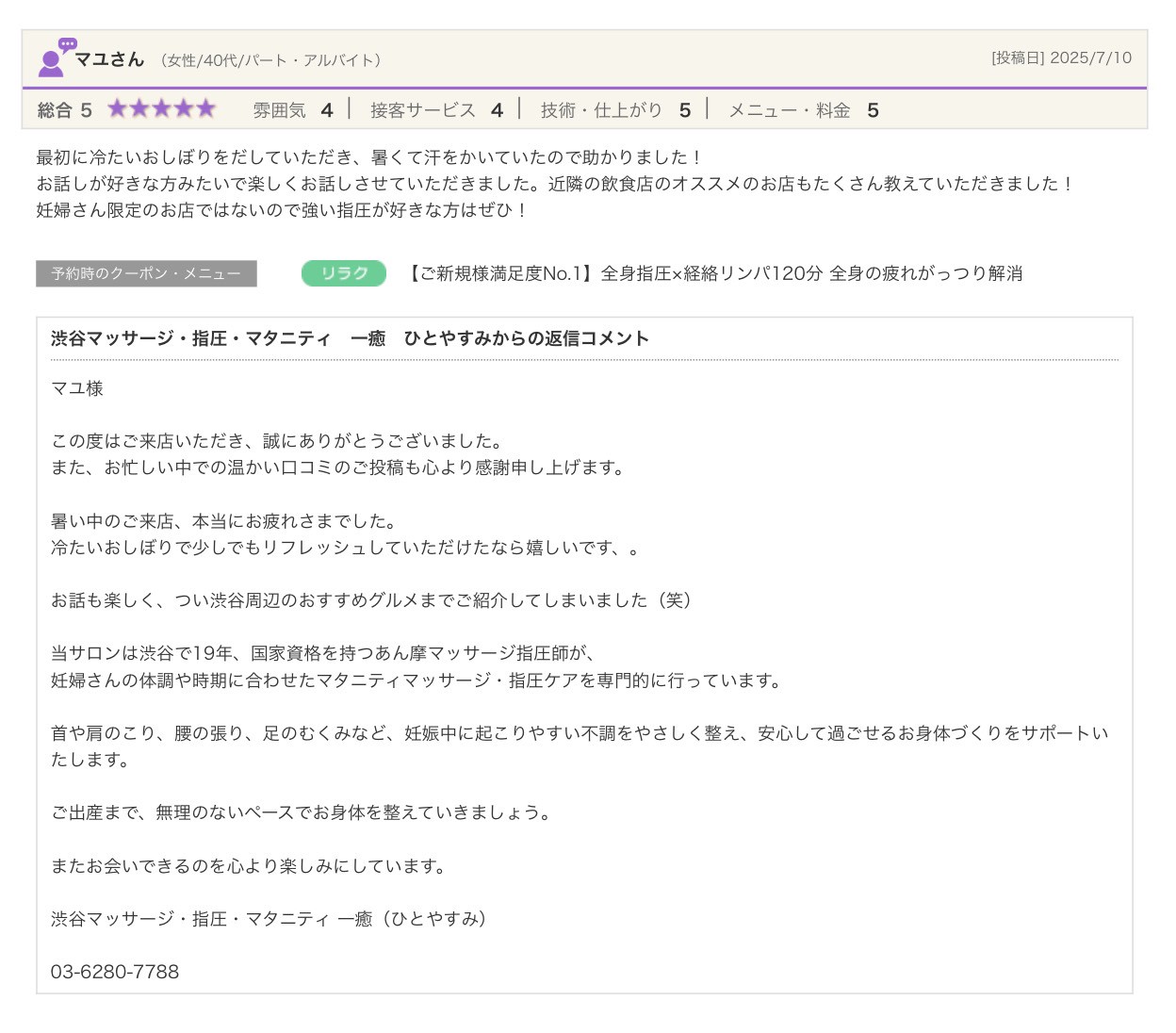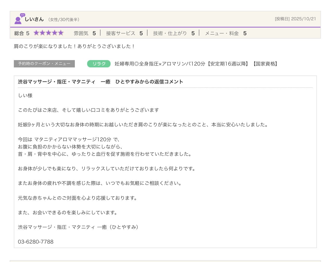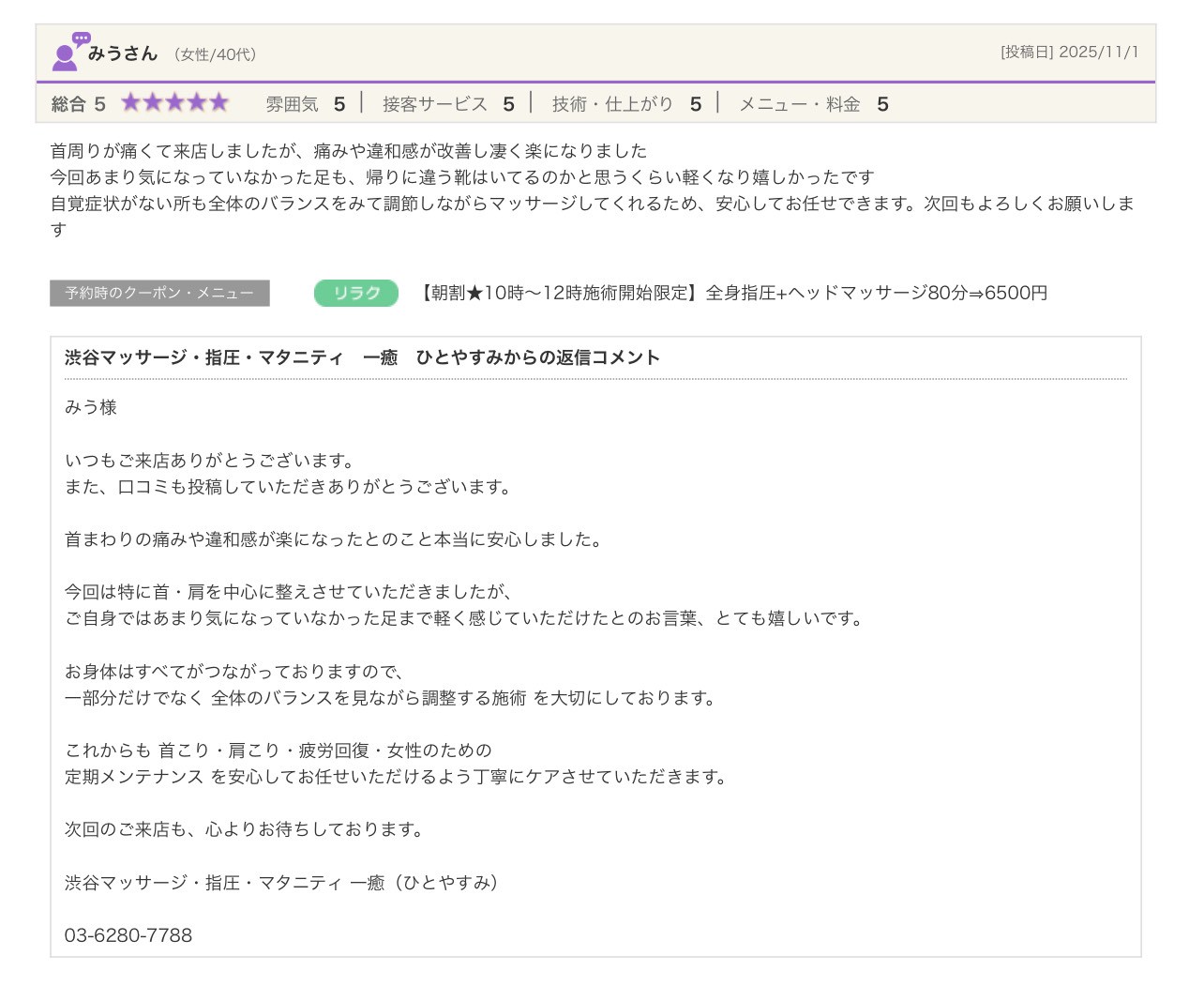 渋谷の指圧・マッサージサロン:一癒(ひとやすみ) > 口コミ > 【2025年】嬉しい口コミをご紹介☆彡