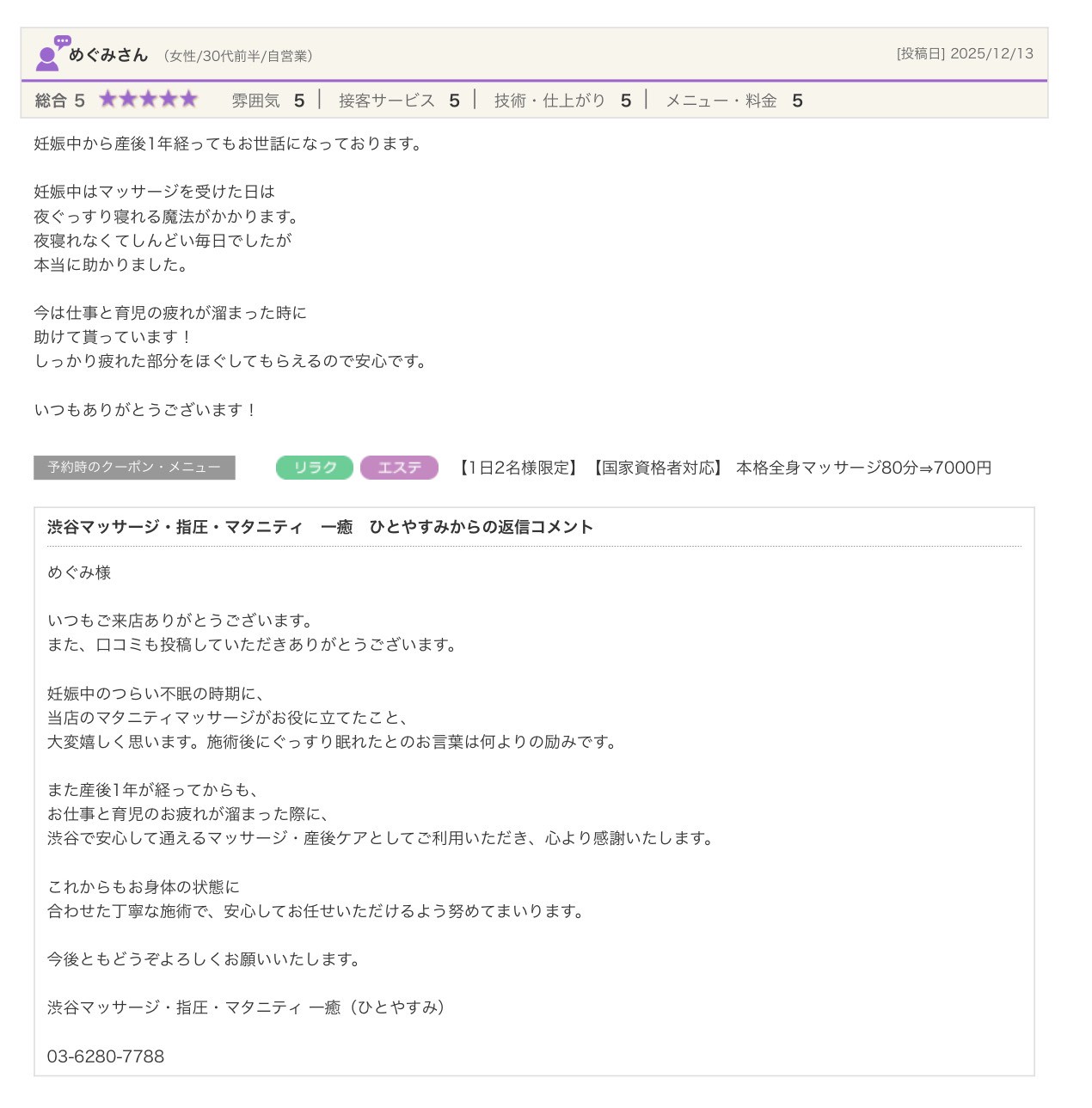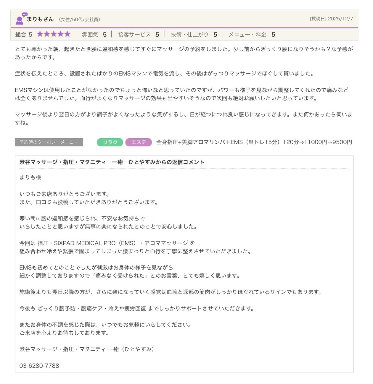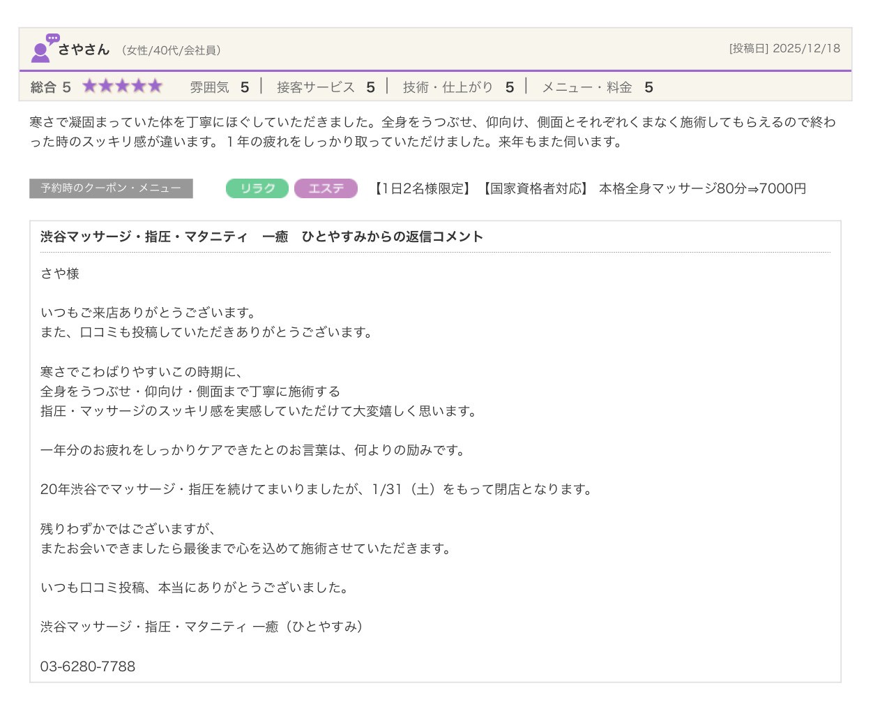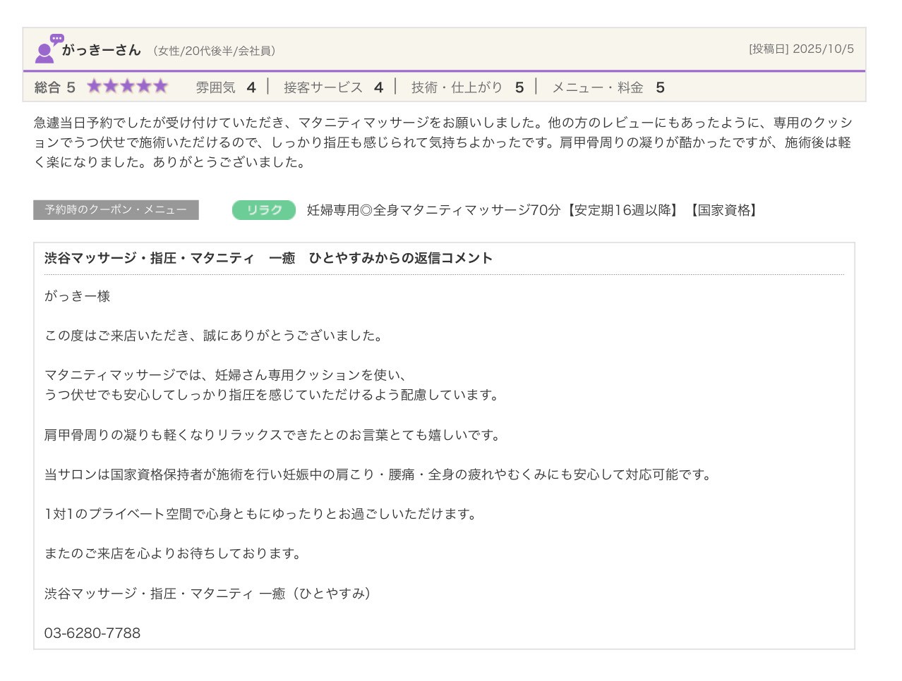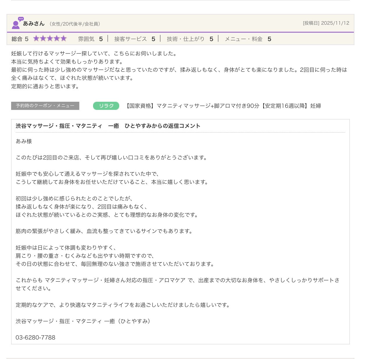 渋谷の指圧・マッサージサロン:一癒(ひとやすみ) > 口コミ > 【2025年】嬉しい口コミをご紹介☆彡