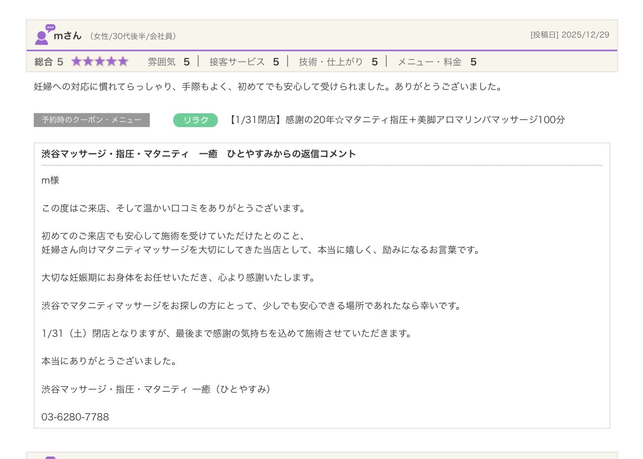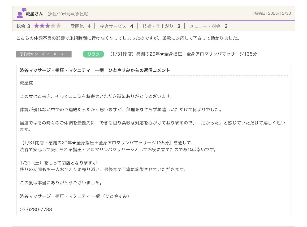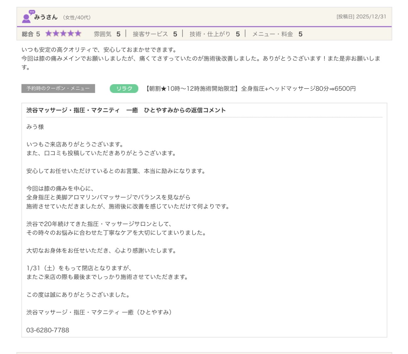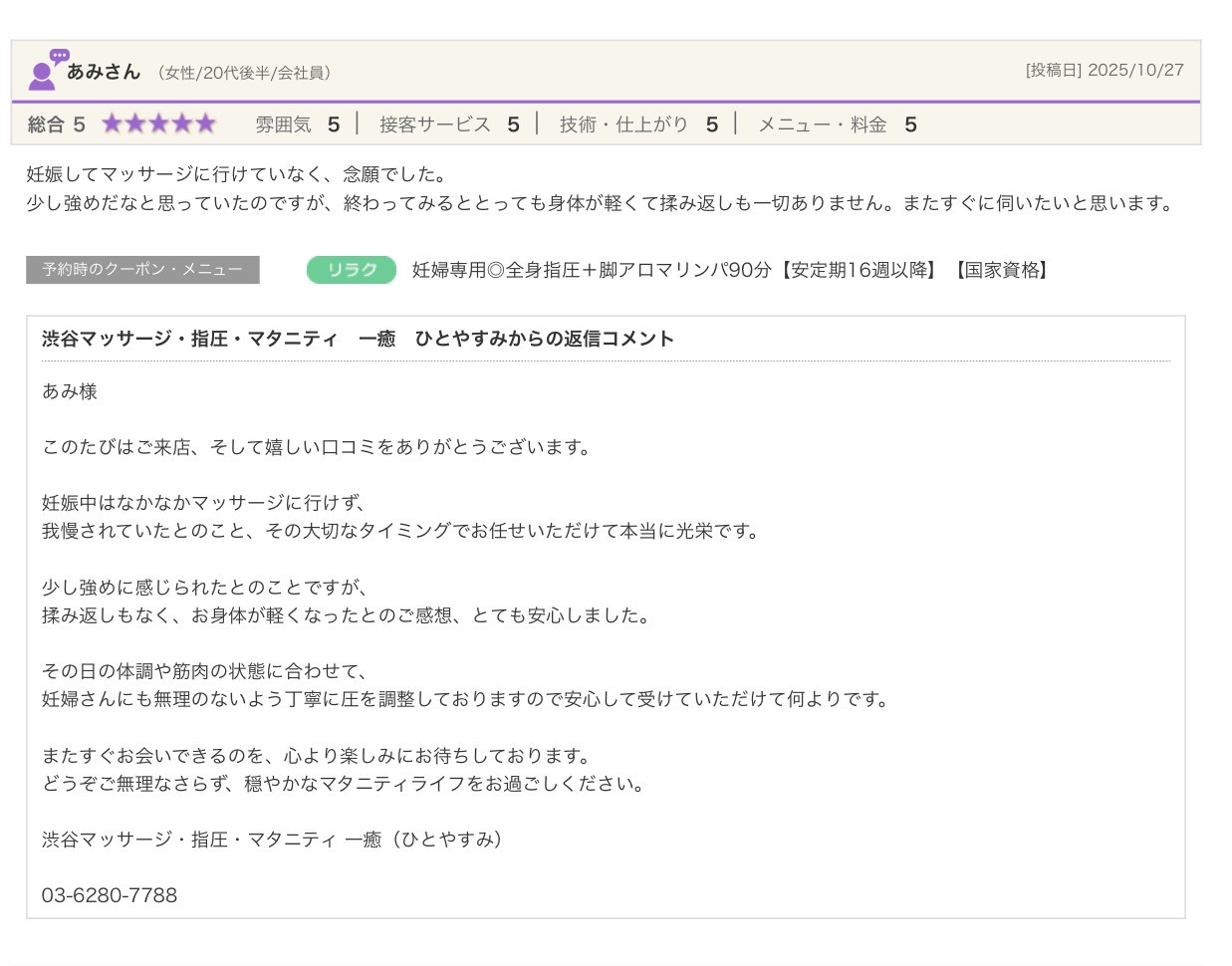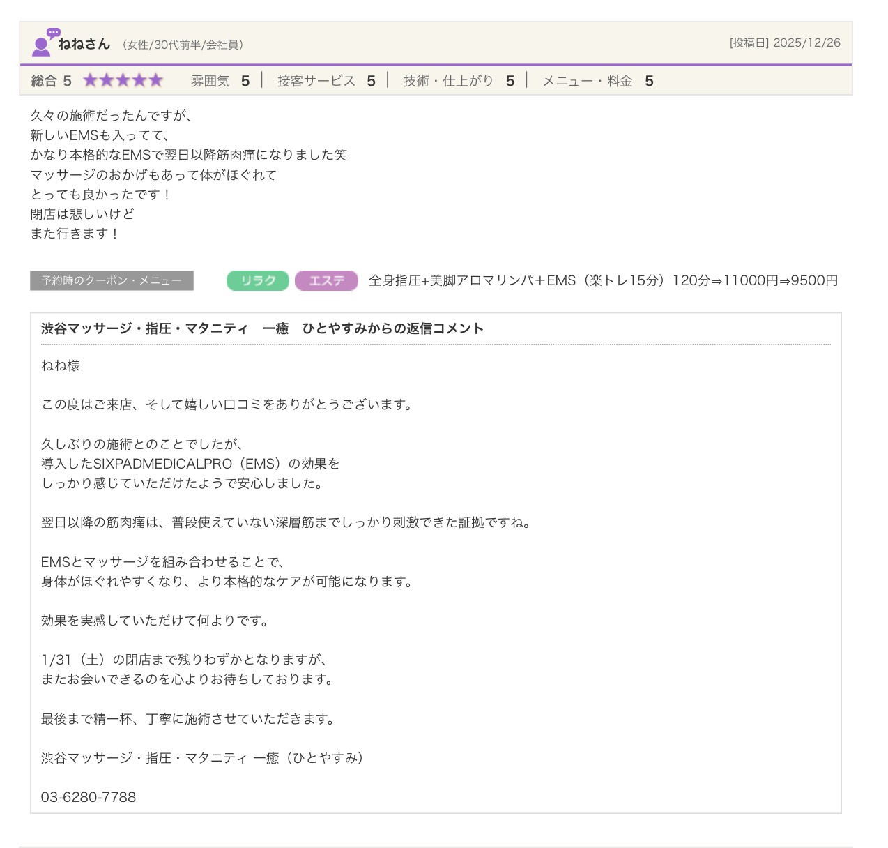 渋谷の指圧・マッサージサロン:一癒(ひとやすみ) > 口コミ > 【2025年】嬉しい口コミをご紹介☆彡