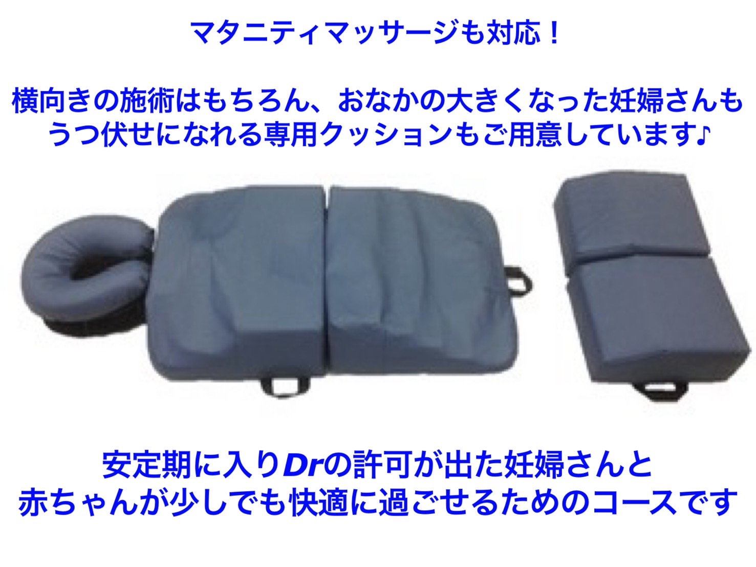 Drの許可が出た 妊婦さんと赤ちゃんが快適に過ごせるコースです専用クッションもあるので横向きの施術も可能!