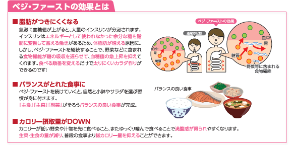 これを「ベジファースト」と呼び、血糖値コントロールに効果的とされています。